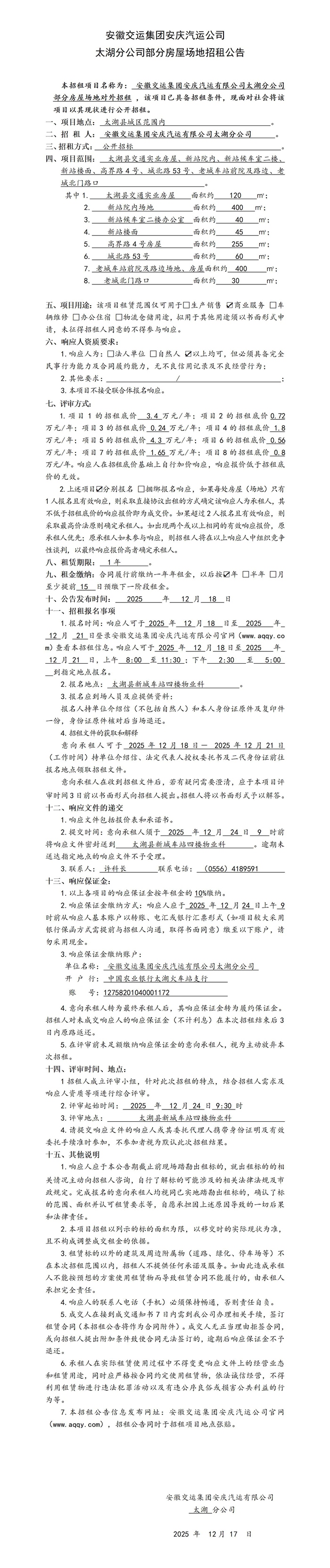 太湖分公司房屋場(chǎng)地招租公告