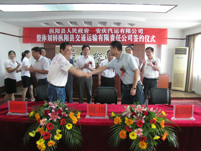 2011年9月1日,樅陽縣人民政府、安徽省交通集團安慶汽運有限公司整體劃轉樅陽縣交通運輸有限責任公司簽約儀式在樅陽迎賓館會議大廳內隆重舉行。樅陽縣縣長何謙、副縣長胡海峰,省交通集團汽車運輸有限公司副總經理方詩喬,安慶汽運有限公司董事長張進、黨委書記徐軍、副總經理王中明、彭宏、紀委書記郭峰,樅陽縣交通運輸有限責任公司經理童子健出席了簽約儀式。