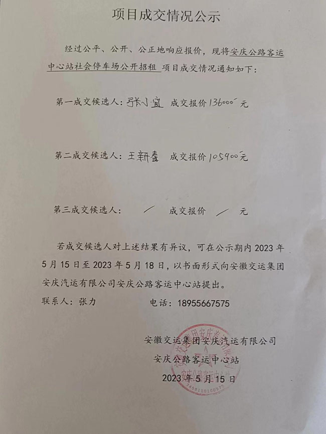 安慶中心站社會(huì)停車場(chǎng)公開招租結(jié)果公示