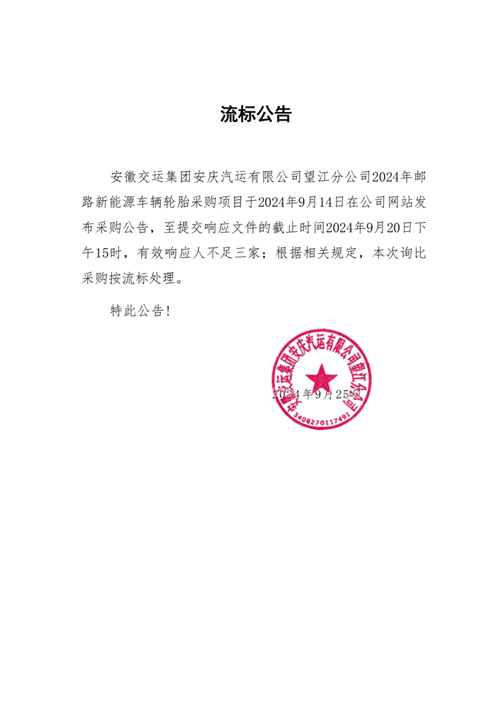 望江分公司郵路新能源車輛輪胎采購(gòu)流標(biāo)公告